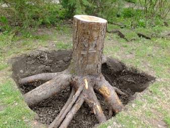 - Механическое удаление. Если вариант с лебедкой исключен, остов можно ликвидировать при помощи обрубки или удаления корней. Если оголить корень не получается, он может перерубаться прямо в грунте ломом или тонкой трубой с зафиксированным на ней топором.