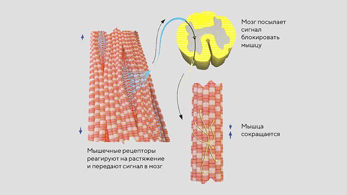 В мышцах есть рецепторы «предохранители» — проприоцепторы. Они чувствительны к растягиванию. Когда мы садимся на шпагат «предохранители» сигнализируют мозгу об опасности и мозг реагирует блокировкой мышц. В этот самый момент нам кажется, что мы достигли максимума и больше растянуться не сможем. Это миотатический рефлекс — важная защитная реакция организма, которая предохраняет мышцы от травм.