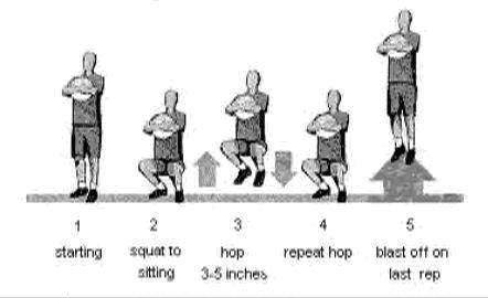 Прыжки в полном приседе — это новое упражнение. Оно должно нагружать целиком бедро и способствовать увеличению его ‘взрывной силы’. Оно увеличивает сердечно-сосудистую выносливость, скорость на коротких дистанциях и боковую скорость.