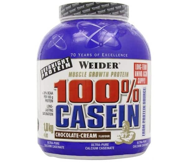 Среди казеинового белка одним из лучших продуктов для набора мышечной массы является 100% Casein от Weider. Он обеспечивает равномерный приток аминокислот в кровь в течение 7 часов.