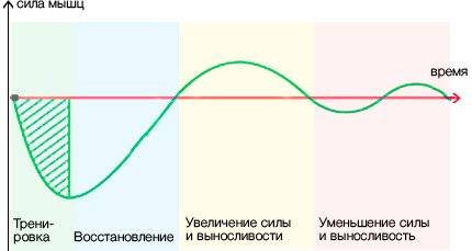 Во время тренировки вы устаете и мышцы ослабевают. После тренировки начинается восстановление организма. Этот период зависит от физической подготовки и вида нагрузок. Длится от одного дня до двух недель.