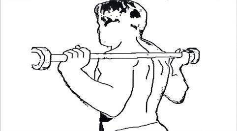 Первое, что необходимо, — поставить подходящий вес на грифе, разместить гриф на трапециевидной мышце на уровне плеч. Захватывать гриф нужно снизу.