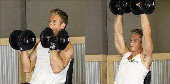 - Жим гантелей вверх сидя — 3 x 8-12