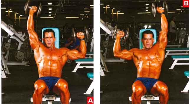 Попеременный жим. Необходимо сесть на скамью, взять гантели и поднять их в стороны и вверх так, чтобы они оказались на уровне головы. В локтях при этом возникает прямой угол. Необходимо поочередно одной рукой выжимать гантель вверх, вторая рука остается в первоначальном положении, т. е. неподвижна в этот момент, так же делаем для другой.